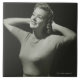 Mujer joven con las manos detrás de la cabeza en estudio, (B&W), marcas del primer el | George el | AssetID: 57539441