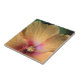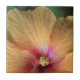 La fotografía original de este pequeño mosaico de cerámica es un cierre de una flor de hibisco naranja. Los pétalos de flores son de color naranja amarillo, convirtiéndose el rosa en rojo profundo en el centro de la flor. Podemos ver los detalles del sistema de polen de la naturaleza, los puntos rojos suaves y las pequeñas flores amarillas. Las venas de los pétalos se pueden ver esparciéndose por sus bordes desgarrados. Un poco de verde y frondoso fondo desata las escaramuzas.