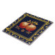 pomegranate farm ceramic tile,mediterranean yellow pink red fruit,traditional persian jewish pomegranates,italian farmhouse home food,decorative folk rustic israeli kitchen,dark navy blue vintage art, "matte golden gold border", "botanical leafy leaves", "arty border perimeter frame", "classic israel iranian iran symbol"