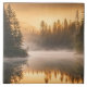 El río fluye entre inmensos pinos, la niebla se levanta del agua fría de la mañana a través de los pinos