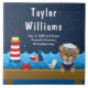 Esta bonita y divertida baldosa cuenta con un oso de marinero sobre una cubierta de madera con gaviota y cangrejo. Al fondo, un faro rojo y blanco, un bonito pájaro en un velero, olas del océano y un cielo estrellado azul marino. El texto combina fuentes audaces y serif para un estilo elegante y moderno. Puede personalizarse con las estadísticas de nacimiento de su bebé, como el nombre, tamaño, fecha y hora de nacimiento, o si desea dárselas como regalo de ducha puede editar y eliminar texto.