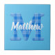 Nombre de los niños con letra M inicial. Impresión de patrón de manchas azules. Baldosas de cerámica decorativas para la habitación de los niños. El texto se puede editar para hacer que este mosaico sea único.