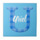 Nombre de los niños con la letra U inicial. Impresión de patrón de manchas azules. Baldosas de cerámica decorativas para la habitación de los niños. El texto se puede editar para hacer que este mosaico sea único.