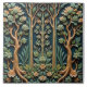 Composición simétrica de tres árboles estilizados con troncos dorados y follaje verde, ambientados en un fondo verde azulado oscuro, intrincados patrones florales, diseño inspirado en la naturaleza, arte decorativo.