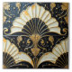 Baldosas cuadradas art decó con un diseño simétrico con formas de ventilador en blanco y negro, acentos florales dorados ornamentados y una textura ligeramente angustiada.