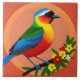 Un pájaro vívidamente colorido descansa sobre una rama rodeada de flores vibrantes en un impresionante fondo de gradiente de atardecer, que evoca sentimientos de calidez, belleza de la naturaleza e inspiración artística.