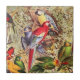 ilustracion vintage de coloridas aves exóticas: loros, aras, macaws, gallos sobre árboles tropicales