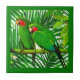 Baldosas cerámicas en un ilustracion de un par afectuoso de loros verdes y rojos sobre una percha de bambú sobre un fondo de follaje de jungla