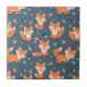Baldosas de cerámica con un patrón hecho con zorros naranjas lindos y felices. Fondo verde oscuro. Las setas y las hojas se rociaron alrededor. fondo de colores pastel delicados y mudos.