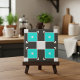 Diseño de cerámica vibrante y moderno con un patrón a cuadros sin fisuras de formas geométricas en verde azulado, negro y blanco.