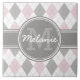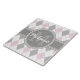 Patrón de estilo de argyle de moda, preppy, en una paleta de colores rosa, gris y blanco. Este patrón clásico y elegante incluye una placa con nombre de círculo con plantillas de nombres y monogramas fáciles de personalizar. Moda, diseño geométrico moderno con un toque personal femenino.