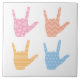 ¡Decoren con amor! Esta cerámica muestra el letrero ASL (Lengua de Rótulo Americana) "I love you" en cuatro lindos y coloridos patrones. Los tonos rosa, naranja y azul combinan con la decoración de las habitaciones.