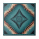 Diseño de patrones geométricos simétricos en formato cuadrado con un esquema de color verde azulado y de cobre. El centro cuenta con un gran medallón en forma de diamante con un trabajo intrincado en la línea y un patrón circular de ráfagas de sol en el interior. El medallón está rodeado por cuatro pequeños marcos en forma de diamante con motivos decorativos. El fondo tiene un efecto de ráfaga de sol radiante que emana del centro, creando un sentido dinámico de movimiento. El borde exterior está formado por picos de tipo aserrante, con matices de cobre, en tonos ojivales contra el fondo verde azulado. Todo el diseño está encerrado por una delgada línea de puntos. La paleta de colores pasa de verde azulado profundo en el centro a tonos turquesa más claros cerca de los bordes, con acentos de cobre en los picos y elementos decorativos. El patrón tiene una influencia de diseño nativa americana o suroeste con sus formas geométricas y sus motivos radiantes.