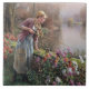 Este diseño presenta un cuadro del artista estadounidense Daniel Ridgway Knight (1839-1924). Muestra a una hermosa joven sosteniendo una barra de pesca de madera en su mano. Ella se está asomando al río para ver si ha pescado. Hay flores florecientes en colores brillantes a su alrededor. También hay algunos peces por sus pies que ya ha pescado. Es una atractiva escena de la vida tradicional y de la pesca de cosecha.