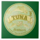 Un ilustracion de la tapa de una lata de atún al estilo pop. Esto se dibuja en vector y tiene el aspecto de un poster de publicidad retro. Tiene atún en ella y se dibuja en tiempos de verde y amarillo. Un diseño para todo aquel que ame el pescado enlatado o enlatado.