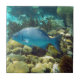 Nadando sobre corales suaves, las escalas de un pescado azul del filón cogen algunos destellos del sol, pues los filtros ligeros abajo desde arriba de la superficie del agua, mientras que otros pescados más pequeños nadan en el fondo.