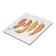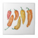 Esta baldosa de cerámica decorativa presenta un patrón ilustrado de pimientos rojos, naranjas y amarillos coloridos y también hace un gran posavasos o salvamanteles. Disponible en dos tamaños. Derechos de autor del arte: Dominic White. Todos los derechos reservados.