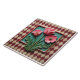 A square tile with a red and cream argyle pattern background, featuring a raised relief of three pink flowers with green stems and leaves, set within a turquoise frame with a red border.