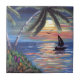 Dos palmeras costeras y un velero en el océano al atardecer con pájaros y flores. Hermoso paisaje marino de pintura acrílica de una playa tropical caribeña. Original pintado a mano por Donna Leger para ©irony diseños
