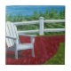 Esta vívida pintura al pastel al óleo presenta una silla Adirondack blanca en una padiatio de ladrillo rojo con vista a Cape Cod. Verde brillante, azul, rojo y amarillo crean un impresionante paisaje marino de verano en la costa de Nueva Inglaterra.