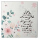 Inspiradora cita escritura azulejos de cerámica representa un hermoso diseño floral con flores rosadas y hojas azules. Presenta la Biblia Verse Proverbs 31:25, "Ella está vestida con fuerza y dignidad y se ríe sin miedo al futuro".
