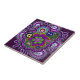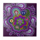 Una baldosa con un colorido diseño psicodélico con flores abstractas, un corazón y un signo de paz. Todo está rodeado de paisajes púrpura.