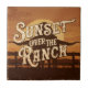 Sumérjase en la belleza nostálgica de una puesta de sol clásica sobre un rancho y un toro con este diseño de baldosa cerámica de puesta de sol retro desgastada vintage. Incluye el texto "Puesta de sol sobre el rancho".