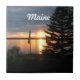 Árbol y asta de bandera silueteados contra la puesta del sol de Maine.