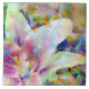 Vibrantes colores mezclados que muestran dos ranas verdes de árbol con ojos rojos y dedos naranjas con una gran lirio rosa y blanco y un fondo floral. Casi acuarela en efecto, pero es fotografía digital y collage.