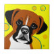 Arte de perro Bóxer vectorial con círculos naranja claro y fondo amarillo.