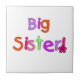 Cajas de sake Big Sister, baldosas, adornos, cuadernos, almohadas, tazas, pegatinas, imanes y más con un diseño de texto verde, rosa, naranja y morado brillante.