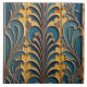 Un panel de estilo vintage con un diseño floral simétrico y estilizado. La paleta de colores se representa en diferentes tonos azules, creando profundidad y dimensión. El fondo es un amarillo tenue que contrasta con el azul frío. El diseño está delineado con un cobre metálico que agrega definición y sentido de edad a la pieza. El estilo general recuerda a la artesanía art déco.