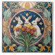 A square tile with a design featuring three white rabbits and a bouquet of flowers, set against a dark blue background with gold stars. The rabbits are positioned in the center, surrounded by a colorful arrangement of red and yellow flowers with green stems and leaves.