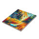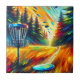 Colorido disco abstracto temática de golf ai artl Bird volando en el cielo, altos pinos, colores otoñales y discos volando por todas partes hacia un pin de golf en disco.