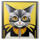 Representación artística estilizada de la cabeza de un gato, creada con formas geométricas audaces y colores vibrantes, que transmiten vibraciones de diseño modernas y creativas.