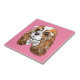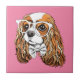 Características del este diseño un retrato de los vidrios que llevan arrogantes de un perro de aguas de rey Charles y una pajarita en un fondo rosado.