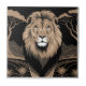 Retrato de León Vintage, este diseño presenta una ilustración vintage de un retrato de un león con una apariencia tranquila y superior. El fondo es un paisaje de safari en blanco y negro con árboles y montañas. La imagen general tiene un estilo art déco.
