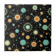 Step back into the groovy era with this vibrant retro atomic starburst pattern on a sleek black background. Bold circles, spiky bursts, and abstract orbits in creamy yellow, teal, coral orange, and mint green evoke the optimistic spirit of midcentury modern design.