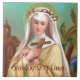 En esta encantadora representación de una huella devocional, el Rosa de Lima (1586-1617) se alza en un paisaje tropical peruano al caer la noche. Pequeñas estrellas amarillas brillan en el oscuro cielo azul-verde detrás de ella. Está flanqueada a la izquierda por una iglesia de tablón de madera marrón y a la derecha por una palmera que se balanceaba. Vestida con el hábito dominicano de color crema que se adapta a su pertenencia al Tercer Orden, lleva una corona de espinas en memoria de la pasión de Cristo sobre su velo blanco. Ella sostiene una armadura de rosas rosas rosas y una cruz de madera. + St. Rosa fue la primera persona nacida en las Américas en ser declarada santa y sigue siendo popular. Es la patrocinadora principal del Perú y de los pueblos indígenas de América Latina, copatrocinadora de Filipinas con San Pudentiana, patrocinadora de las Américas en general, y patrocinadora de Santa Rosa, California, y su Diócesis. Además, es la santa patrona de bordadores, jardineros y floristas. Naturalmente, rosas de todas las variedades se han convertido en su atributo. En el arte, la representan coronada de rosas, sosteniendo rosas (como aquí), o en un ambiente con rosas en macetas o arbustos rosas floridos. + Festín: 23 de agosto + Crédito de la imagen (M 024): Imagen antigua de San Rosa de Lima de un cromolitograma devocional impreso en Alemania, editorial original desconocido a finales del siglo XIX y principios del siglo XX, de la colección privada de ephemera religiosa del diseñador.