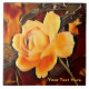 Representación estilizada de un rosa amarillo-naranja sobre un fondo rojo oscuro y naranja. Añade tu propio texto.