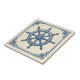 esta baldosa de cerámica tiene una rueda de capitán de estilo vintage en azul sobre blanco roto con un borde azul elegante. Imagen generada con IA.