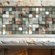 This dramatic design features a mosaic of rectangular and square shaped tiles in random sizes and natural earth tones with soft sage green. The variation throughout each tile mimics an authentic aged appearance with scuff marks and warm, well-loved appearance to bring rustic charm to any interior setting. This pattern is part of a coordinated trio that can be mixed and matched for a rich, natural-looking variation across multiple tiles, ideal for a country farm house look as kitchen or bathroom decor. Search ID1187a, b and c to see each of the variations. Note: design contains generative content.