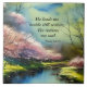 Inspiradora cita escritura azulejos de cerámica representa una hermosa pintura de acuarela natural con un tranquilo arroyo de agua bordeado de árboles floridos rosas y un cielo azul. Presenta una parte de la adorada y motivadora Biblia Verse 'El Señor es mi Pastor', Salmo 23:2-3, "Él me lleva al lado de las aguas quietas, Él restaura mi alma".