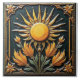 A square relief sculpture with a dark green background, featuring a central yellow sun with radiating rays, surrounded by stylized yellow flowers and green leaves, all within a decorative border. The sun is a solid yellow circle with a cracked texture, and its rays are elongated and pointed.