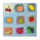 El diseño es de diferentes tipos de fruta, dibujada sobre un fondo azul y cada fruto sobre un fondo de colores. Esta imagen está disponible en una variedad de otros productos, sólo tienes que hacer clic en el enlace debajo de la foto cerca de 'Acerca de este diseño'.