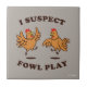 "I Sospect Fowl Play" gráfico de pollo diseñado por bCreative muestra un par de pollos marrones jugando por ahí! ¡Esto es un gran regalo para la familia, los amigos o un regalo para usted mismo! Este gráfico divertido es una gran adición al estilo de cualquiera. bCreative es un creador líder y licenciante de diseños y propiedades originales y de moda. ©LCT Creative. Licencia de bCreative.com