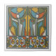 This striking design features a highly stylized, symmetrical floral arrangement, combining the organic flow of flowers with bold, structured geometry. The composition, reminiscent of a graphic Art Nouveau or stained-glass panel, utilizes a rich Mid-Century Modern palette of deep olive green, teal, burnt orange, and mustard yellow. The border features a playful, repeated circular pattern. This vibrant and decorative tile is perfect for adding a structured, colorful accent with a vintage, handcrafted feel to any space. Search ID1224 to see other designs in this series. Note: design adapted from generative content.