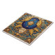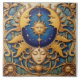 Una baldosa con una mujer que duerme mientras un sueño aparece encima de ella con un sol con la cara flanqueada por seres celestes flotando en un cielo estrellado rodeado de adornos dorados.