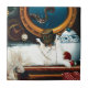 Gato de vapor de peluche blanco con su lindo sombrero de top marrón y gafas. El gato está sentado en un mostrador de la cocina del barco esperando su hora de té. Detrás de él está la ventana del barco que tiene un pulpo pasando.