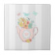 Baldosa cerámica con un ilustracion caprichoso. Una tetera rosa con un pequeño corazón rosado en el centro y un ramo de flores en el interior. Delicadas mariposas de colores pastel revolotean por todas partes. Sobre un fondo rayado gris y blanco.